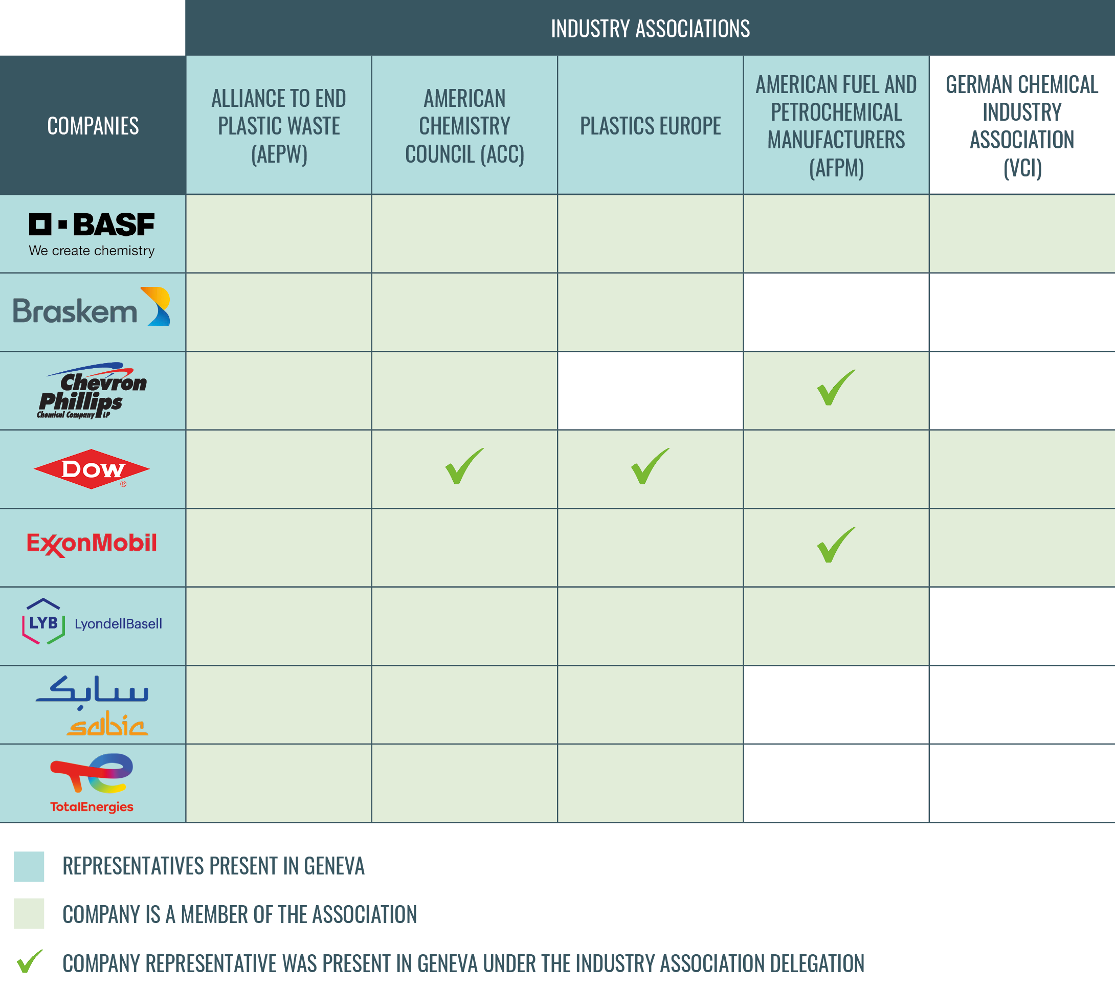 For a deeper understanding of the links between negative actors, the table below provides an overview of companies that are members of the Alliance to End Plastic Waste and have either engaged on the Treaty since INC-5.1 or participated in the Geneva negotiations. It also details their memberships in other key negative industry associations representing chemical and petrochemical interests and their participation on behalf of these associations in Geneva.