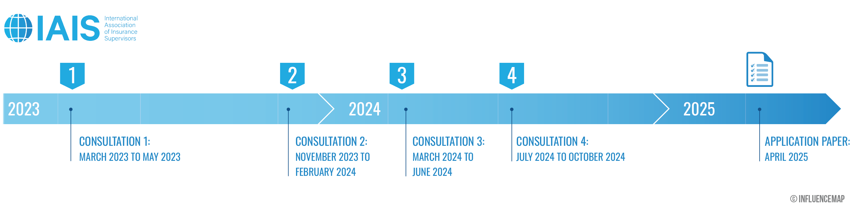The first IAIS climate risk consultation, which ran from March to May 2023, proposed explicitly naming climate risk within the global framework for insurance supervision. The consultation set out to assess whether necessary to make changes to existing material related to corporate governance and risk management and internal controls, and to seek feedback on its overall climate-related supervisory guidance work. InfluenceMap’s 2023 briefing assessed initial responses to this consultation, but the IAIS had not yet released its full list of consultation responses upon publication.