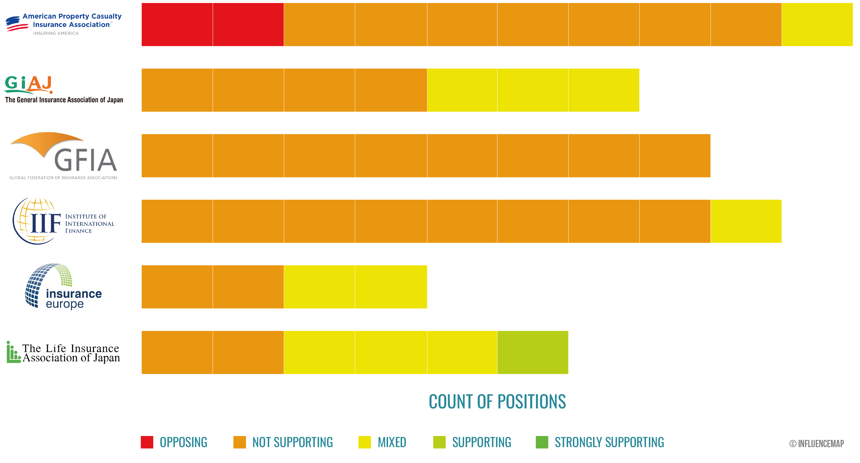 The IAIS has identified climate risk as a strategic theme, and throughout 2023 and 2024, the body ran four climate risk-related public consultations. The consultations sought feedback on proposed changes to certain Insurance Core Principles (ICPs)—a globally accepted framework for insurance supervision, consisting of Principle Statements, Standards, and Guidance—and on new supporting material for insurance supervisors to better incorporate climate risk into supervision of the insurance sector. As these guidance papers are likely to inform insurance supervision across jurisdictions, InfluenceMap has tracked and analyzed industry associations’ responses to these consultations.