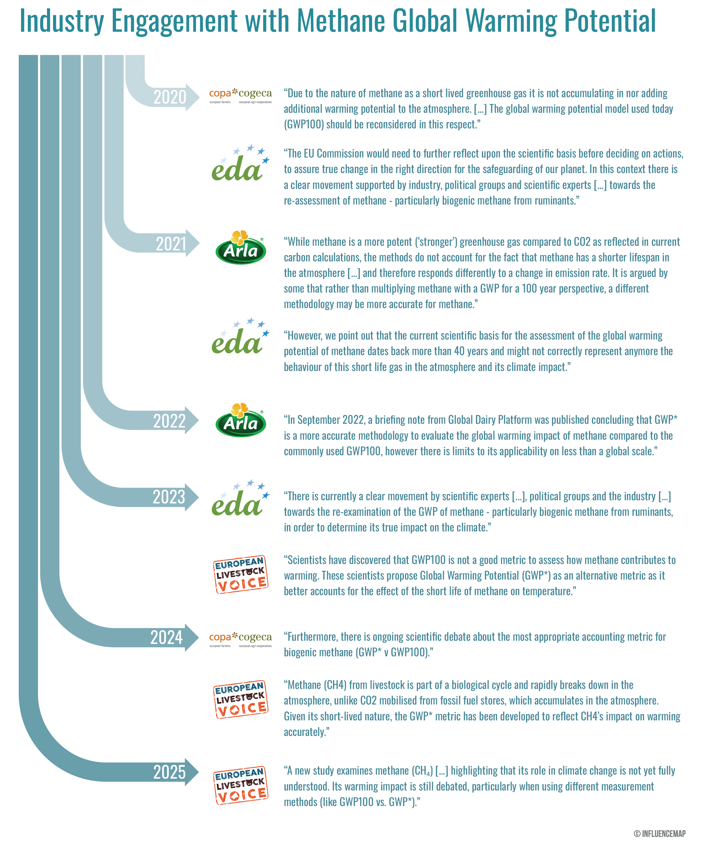 Industry promotion of GWP* comes in parallel with intensive engagement from the agricultural industry to weaken the case for robust methane policy for the sector. Previous InfluenceMap analysis outlined a two-pronged playbook, by which industry simultaneously minimizes the climate impact of methane emissions from livestock production in a manner that suggests it is a less harmful form of pollution, and pushes the narrative that methane regulations would bring about negative real-world impacts, such as on food security and prices.