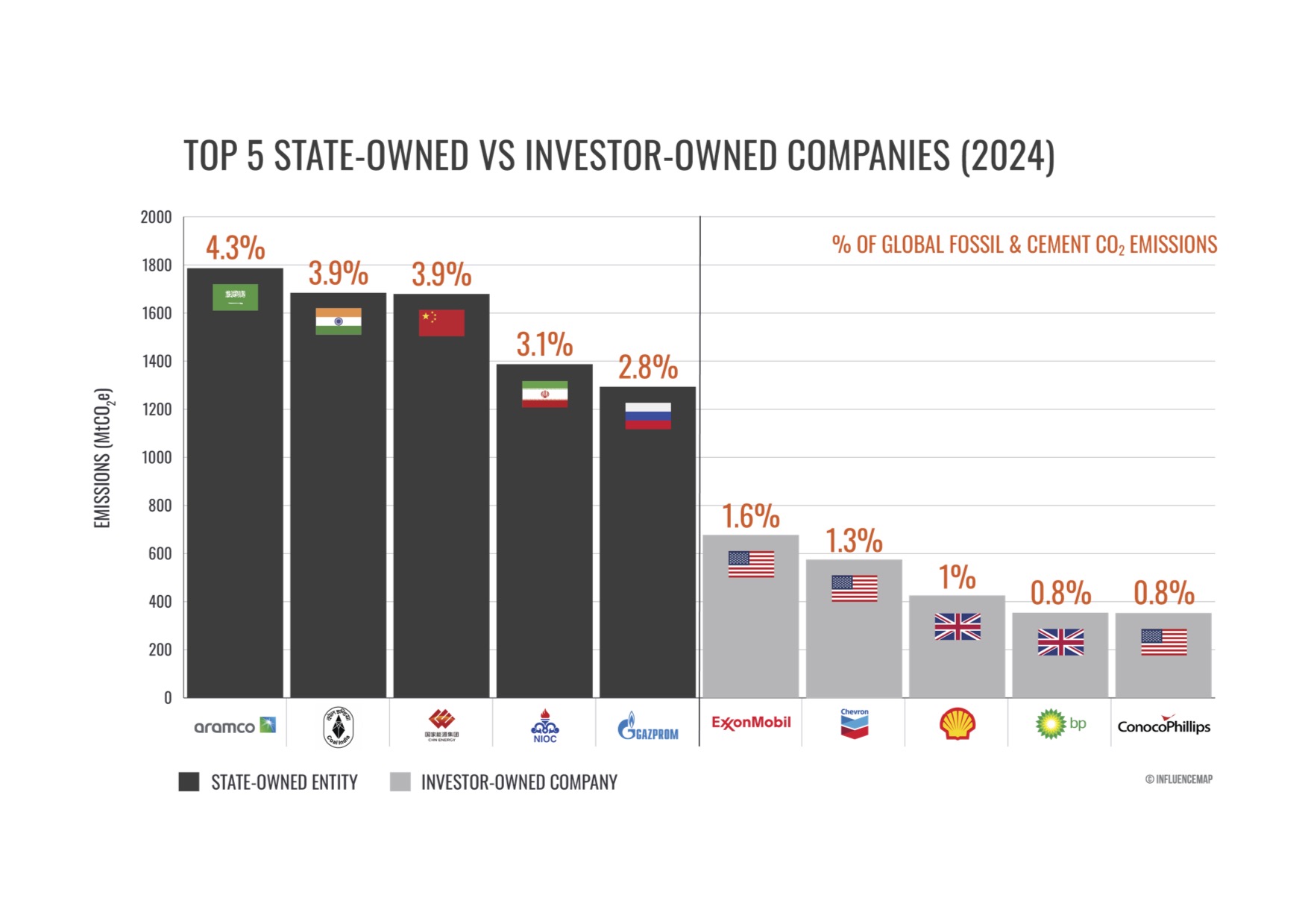 In 2024, the top five state-owned emitters—Saudi Aramco, Coal India, CHN Energy, National Iranian Oil Co., and Gazprom—were responsible for 18.0% of global fossil fuel and cement CO₂ emissions (7.8 GtCO₂e). Notably, Coal India, CHN Energy, National Iranian Oil Co, and Gazprom all increased their emissions in 2024 compared to 2023.