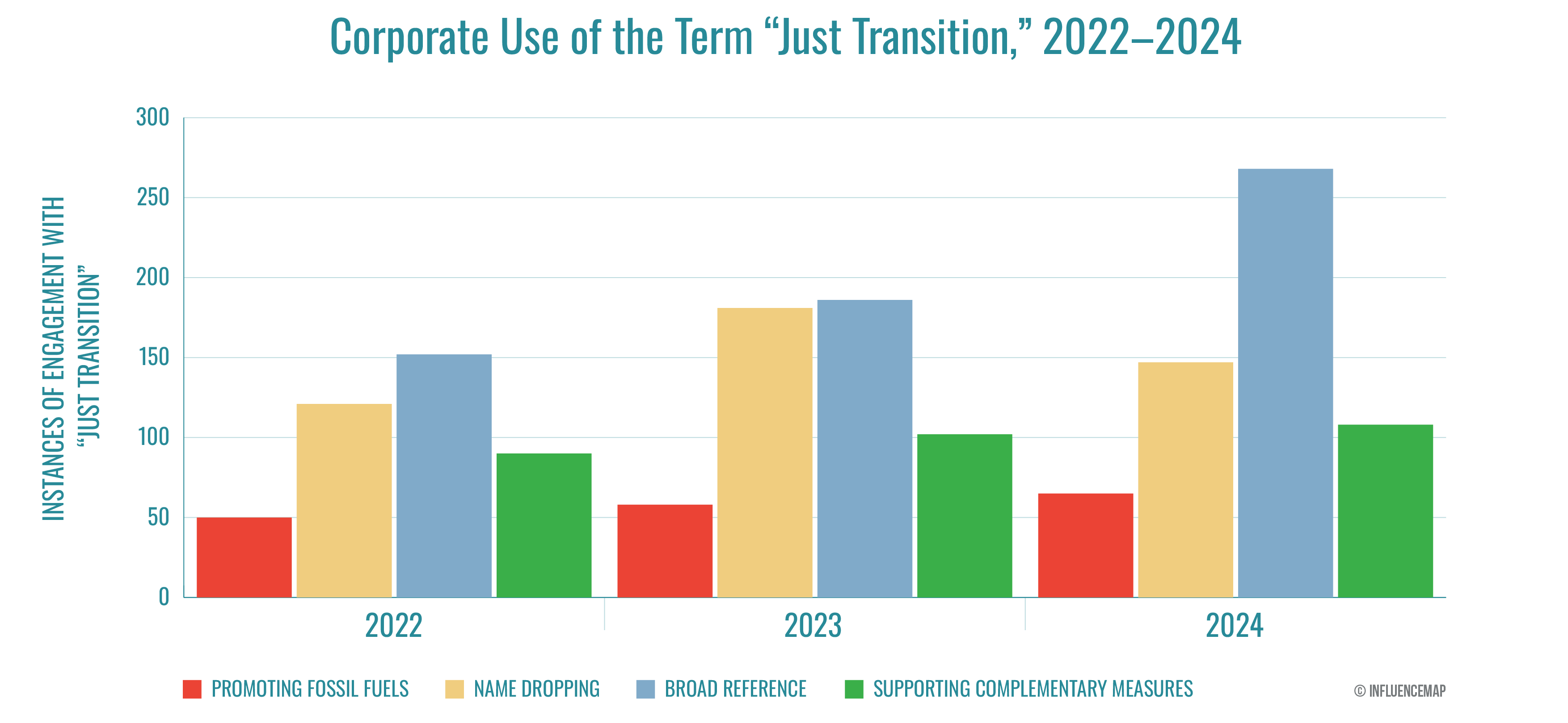 Between 2022 and 2024, the number of references to a “just transition" increased overall. While the use of "just transition” in both the context of promoting fossil fuels and alongside support for complementary measures rose gradually, broad references to the term in these corporate communications increased significantly.