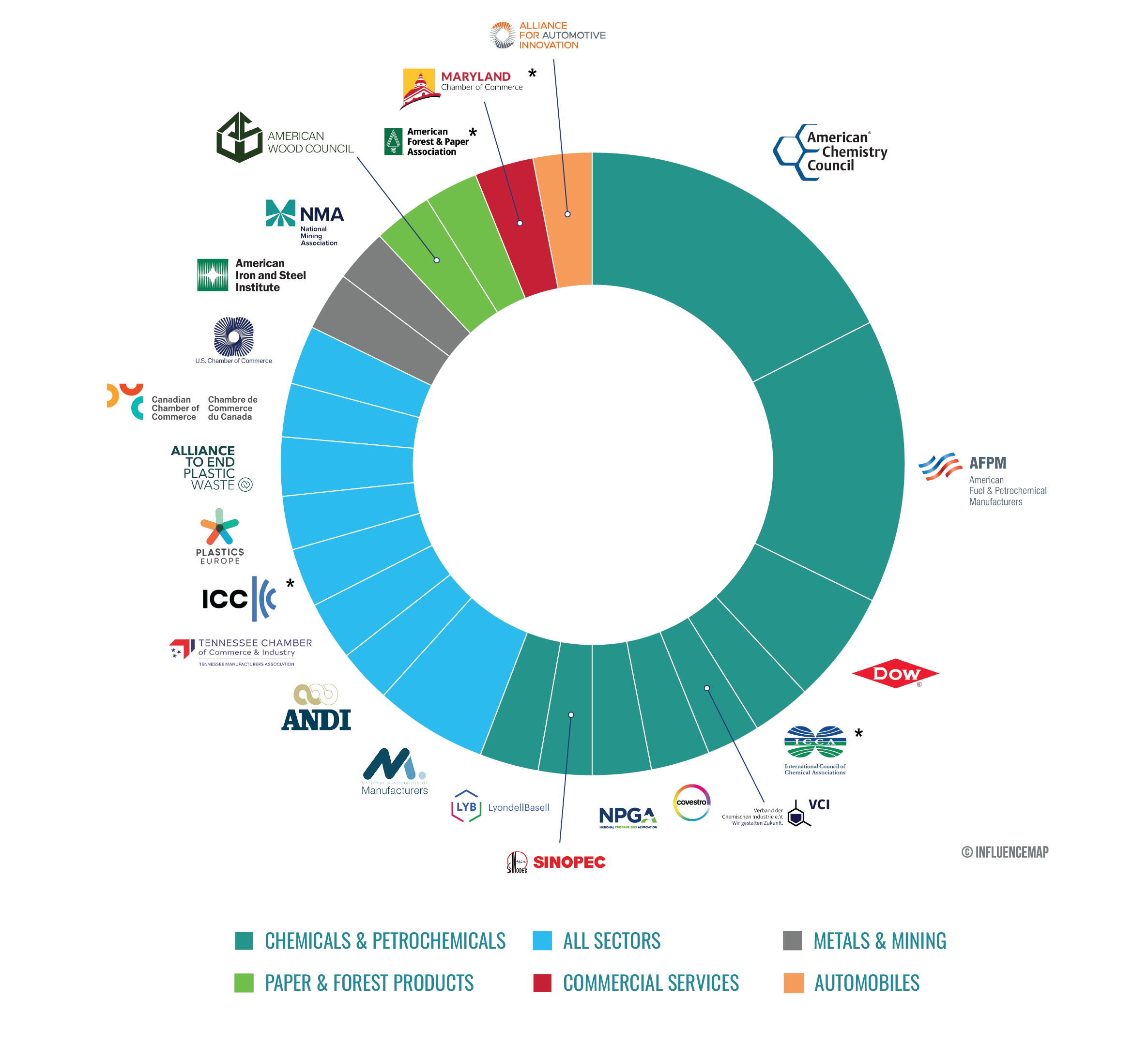 Analysis of these entities finds that 56% of negative lobbying came from companies and industry associations in only two sectors, the chemical and petrochemical sectors. Negative companies include LyondellBasell, Covestro, and the China Petroleum & Chemical Corporation (Sinopec). Negative industry associations were the most highly engaged, with almost half of the negative advocacy tracked (41%) coming solely from five key players: the American Fuel & Petrochemical Manufacturers (AFPM), the American Chemistry Council (ACC), the German Chemical Industry Association (VCI), the US National Propane Gas Association (NPGA), and the International Council of Chemical Associations (ICCA). A further 26% of negative engagement came from cross-sector industry associations, many of which have chemical and petrochemical companies as members, such as the National Association of Manufacturers (NAM) and the US Chamber of Commerce. InfluenceMap analysis repeatedly finds that, although these cross-sector groups have memberships that span all sectors of the economy, their lobbying positions on climate most often reflect those of their most negative members.