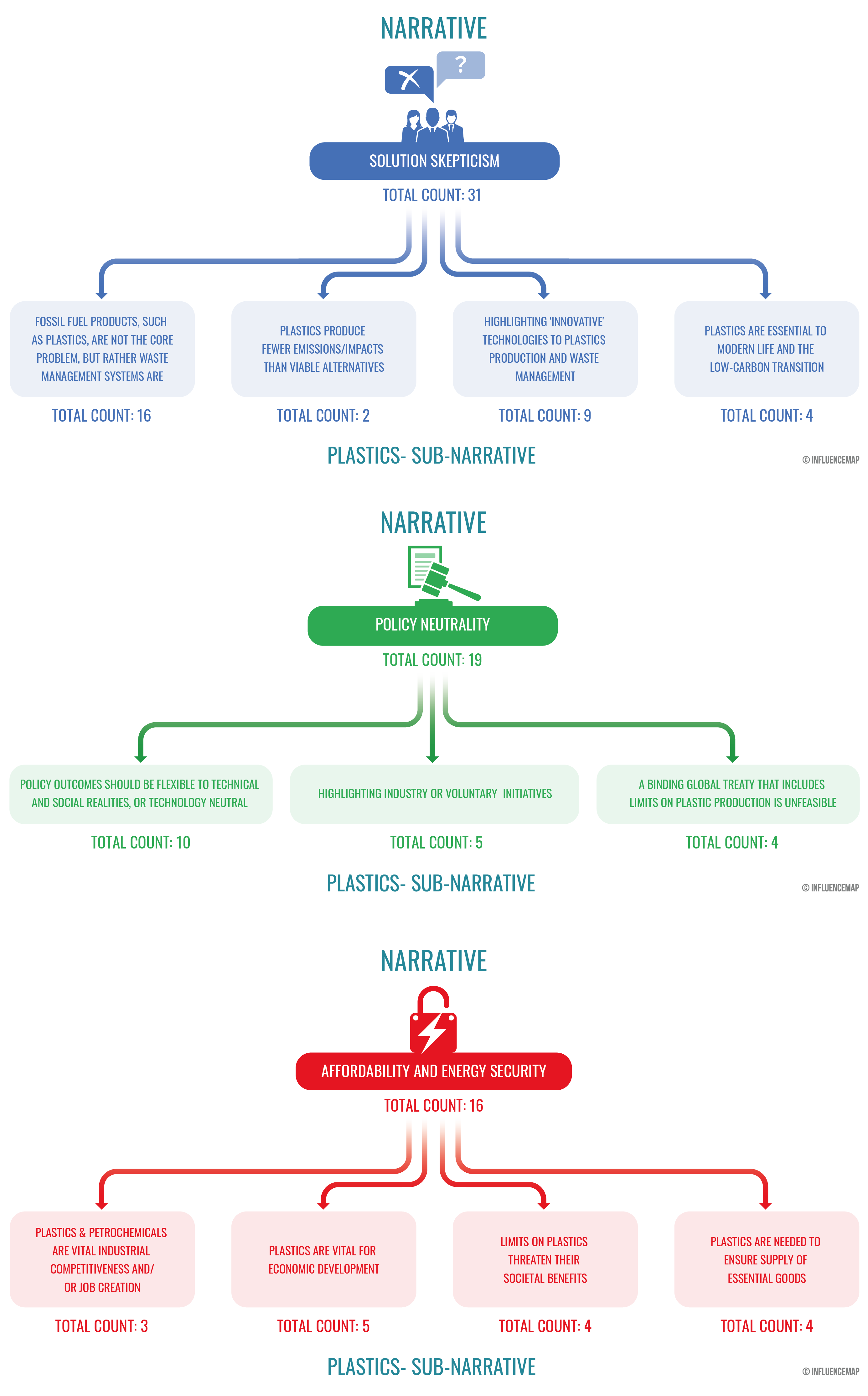 A detailed assessment of the narratives used in negative engagement on the Treaty shows that companies and industry associations in the chemical and petrochemical sectors deployed well-worn fossil fuel talking points, adapted for the plastics context, to make their arguments and preserve a market for fossil fuels in the plastics value chain. These arguments—which previous InfluenceMap research has shown contrast with the findings of the Intergovernmental Panel on Climate Change but have been used for at least the last 60 years—can be grouped into three main narrative threads: (1) “Solution Skepticism” which downplays the viability of alternatives to fossil fuels and their products, as well as the negative impacts associated with their use; (2) “Policy Neutrality,” or promoting technologically “neutral” solutions that leave room for the status quo; and (3) arguments around “Affordability and Energy Security.”